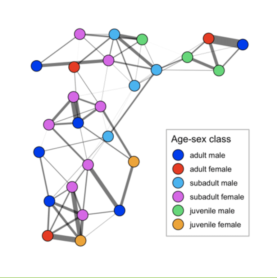 A baboon social affiliation network. Nodes represent individual baboons (colored by their age-sex class), and the width of the lines connecting the notes represent the rate of sitting in close proximity. Thicker lines indicate more affiliative relationships. Source: R. Harel, unpublished data