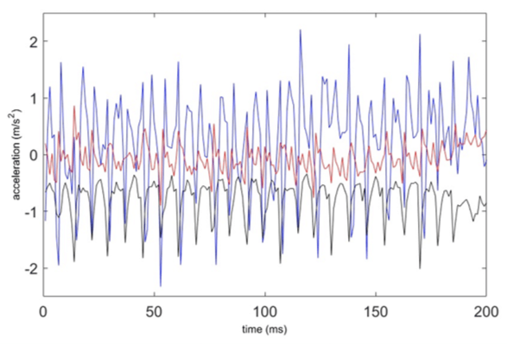 Tri-axial accelerometer measures extracted from a baboon’s collar, plotted over time. The blue line represents the Z-axis (dorsal-ventral) acceleration. Peaks in the blue line indicate footfalls. Source: R. Harelunpublished data