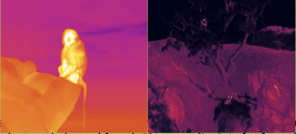 A close-up thermal image of a baboon, and (right) a thermal image of a baboon group in its sleep site (the bright yellow dots are baboons’ faces). Photo credit: C. Loftus, unpublished data