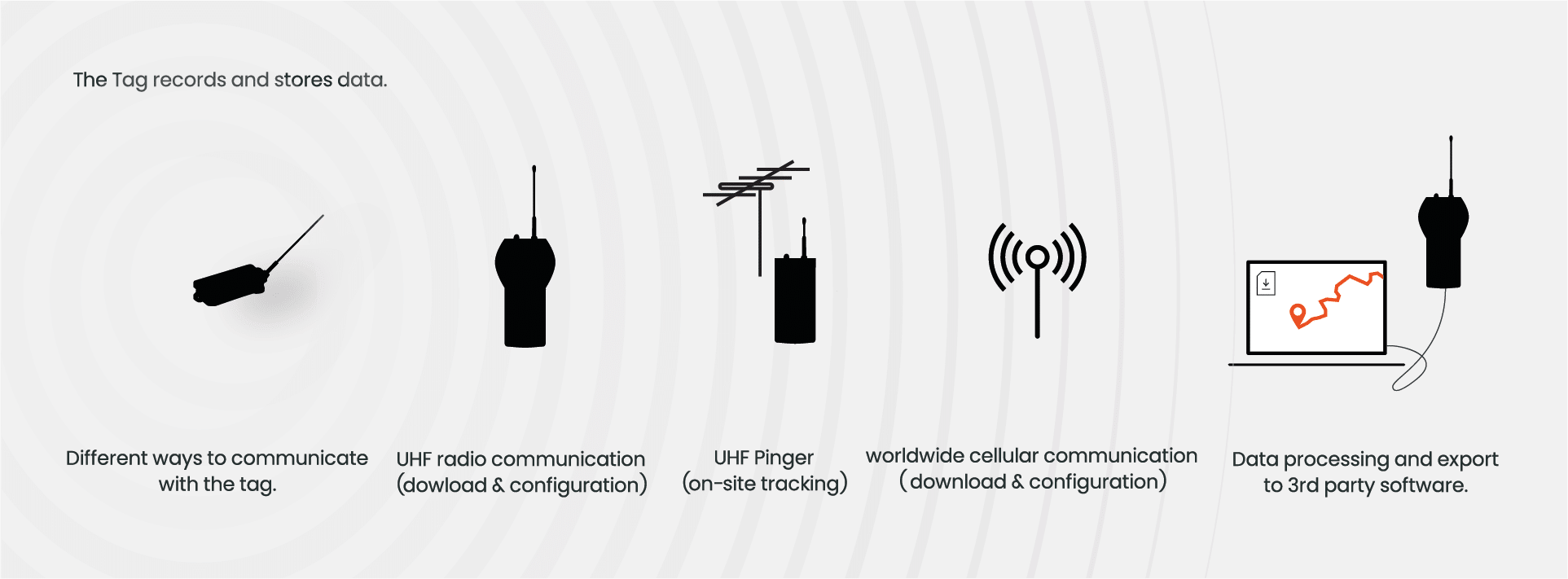 The tag records and stores data on a non-volatile memory chip. e-obs offers a variety of options for retrieving data from the tag. Standard terrestrial tracking (pinger), local download using UHF radio communications with minimal power requirements and high data rates, to a global system using cellular commuication. We have the right tool for every situation.